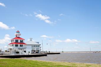 Hop back on the bus to travel along the south shore of Lake Pontchartrain, past a post-Katrina pumping station, seafood restaurants, marina and a historic lighthouse with the 24 mile long Causeway Bridge in the distance. Although called a lake, Lake Pontchartrain is actually one of the largest brackish estuaries in North America at 630 square miles (1600 km2) fed by fresh water rivers and connected to the Gulf of Mexico.
